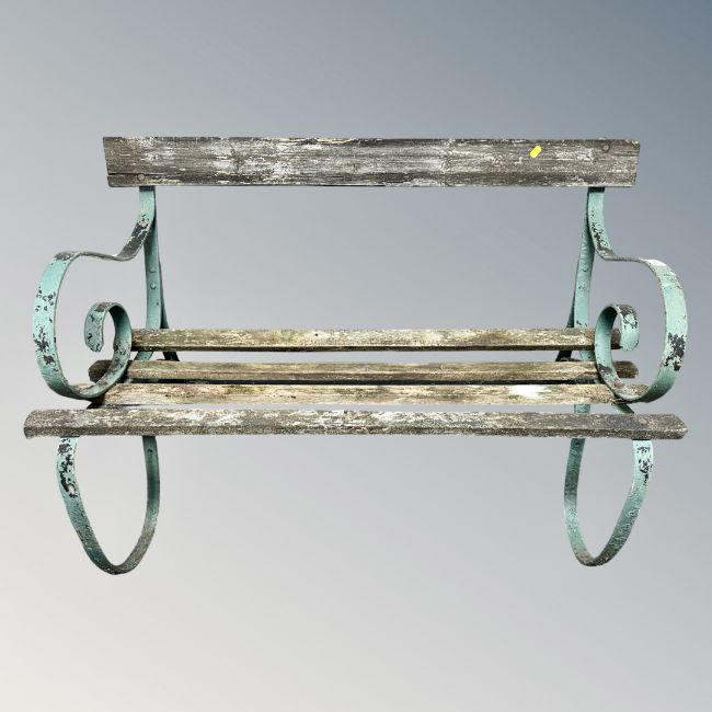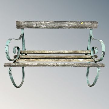 A wrought metal and teak garden bench