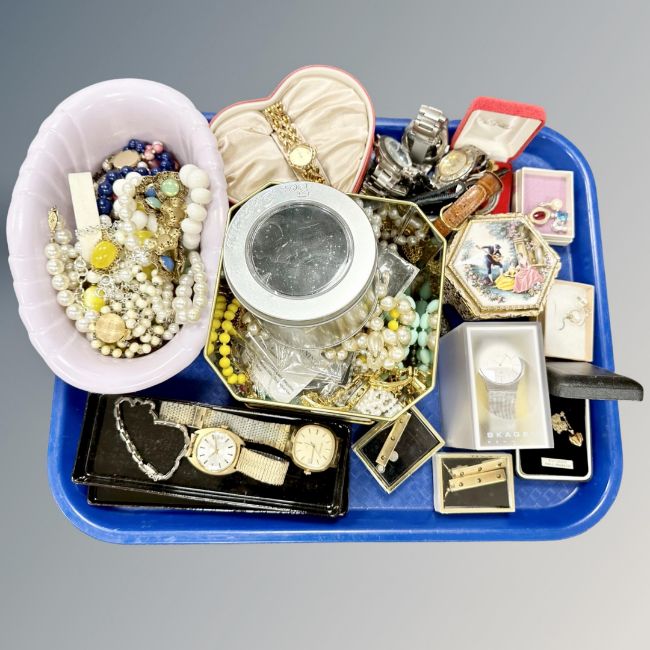 A tray of costume jewellery, silver bracelet, wristwatches etc