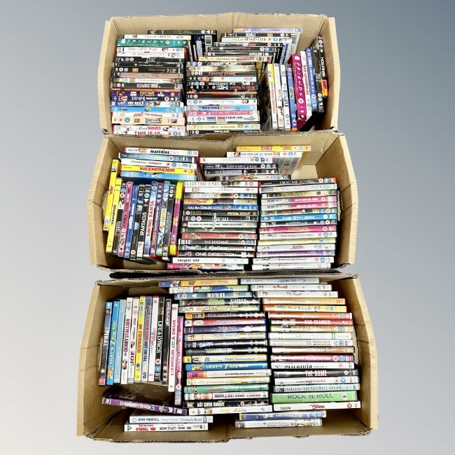 Three boxes containing approximately 150 DVD's