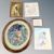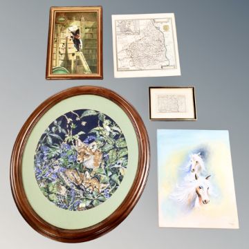 A box of assorted pictures, framed, map of Northumberland, un-framed oil etc
