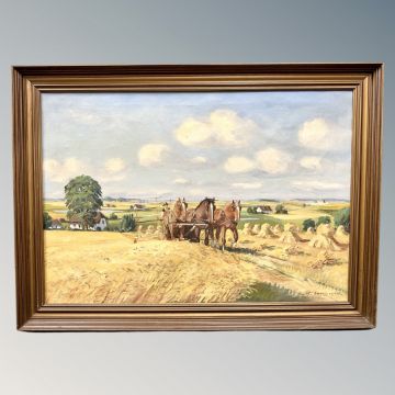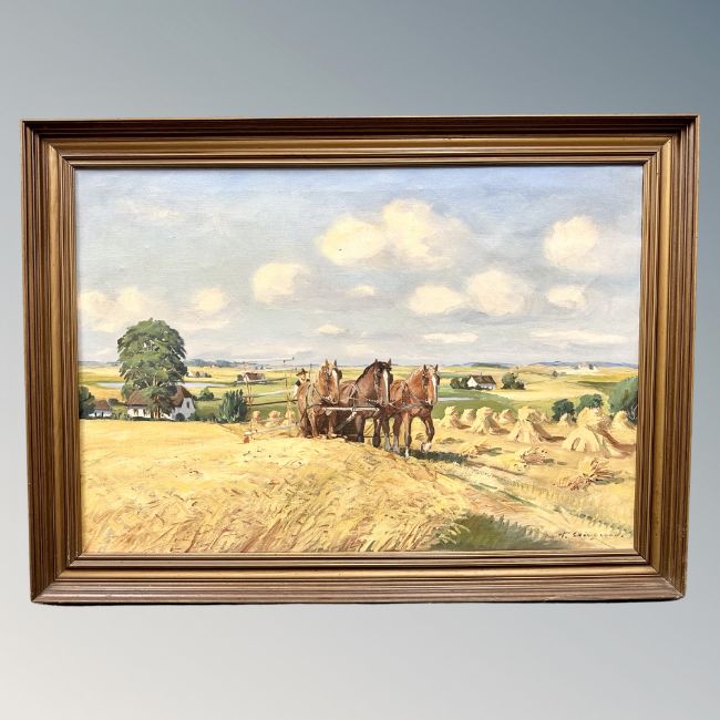 Continental school : Work horses in a hay field, oil on canvas, indistinctly signed, 95cm by 66cm