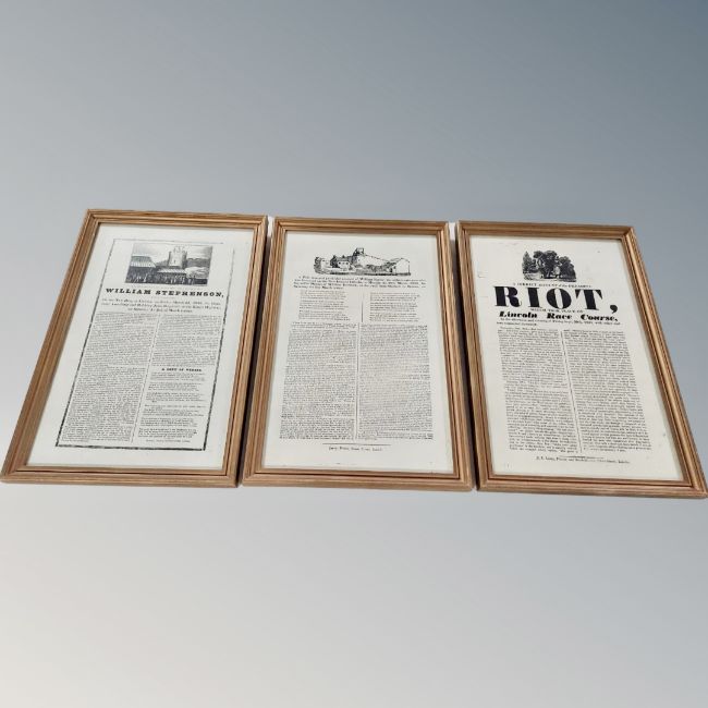 Three reproduction gilt framed prints : The riot at the Lincoln Racecourse 1831, The Trial and Execution of William Stephenson 1833 (3)
