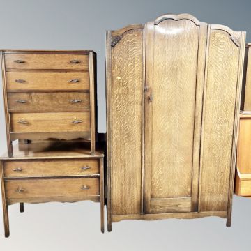A 1930's oak three piece bedroom suite comprising of dome topped wardrobe, two drawer dressing chest and matching four drawer chest