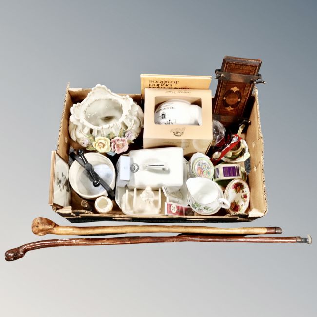 A box of two walking sticks, continental ceramic table centre piece, inlaid tie press, tea china, Maling ware, Minton etc