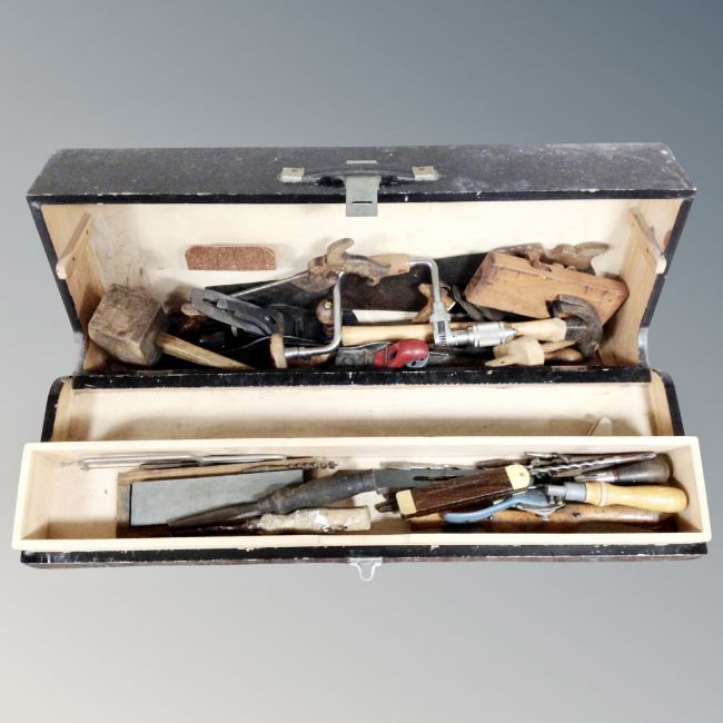 A vintage wooden joiner's tool box of hand tools