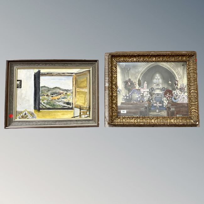20th century school : Landscape viewed through interior window, watercolour, together with three further pictures (4). *Provenence : Property of the Earl of Durham, Lambton Castle, County Durham.