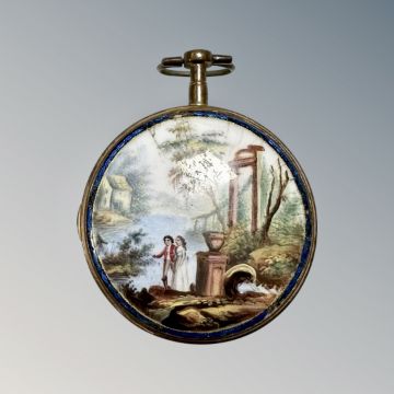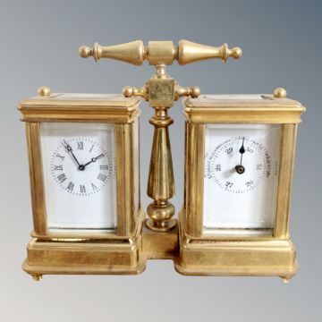 A brass cased combination mantel timepiece / barometer, together with an enamelled pocket watch with single fusee movement. *Provenence : Property of the Earl of Durham, Lambton Castle, County Durham.