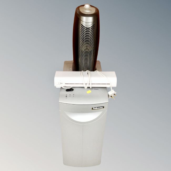 A Fellows SB-95C paper shredder, three speed air purifier, and a hand held shredder