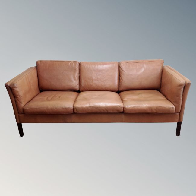 A Scandinavian brown leather three seater settee, length 196cm