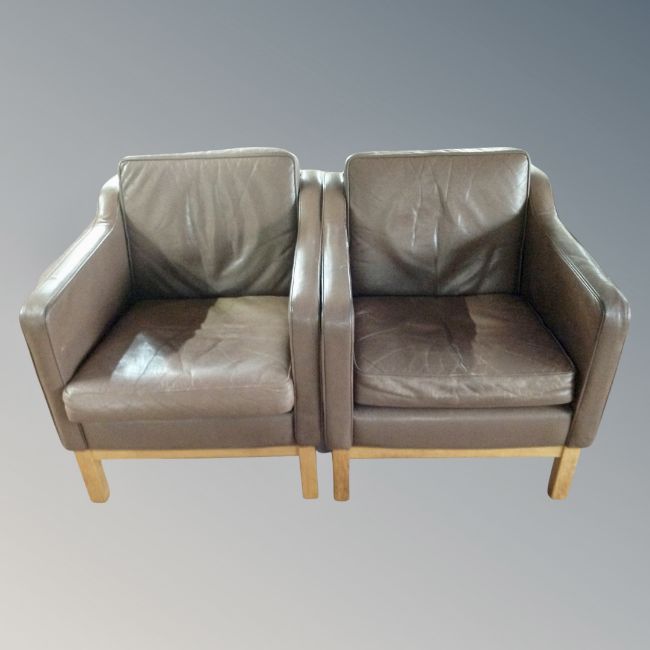 A pair of Scandinavian brown leather armchairs