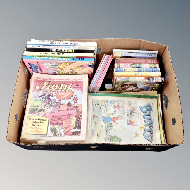A box of vintage annuals including Jinty, Bunny, etc and a small quantity of books : Enid Blyton, Biggles, etc