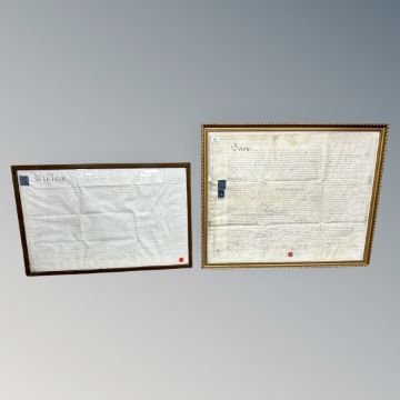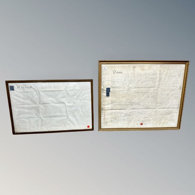 Two framed 18th/19th century indentures on vellum, the largest 90 cm x 74 cm (2). *Provenence : Property of the Earl of Durham, Lambton Castle, County Durham.
