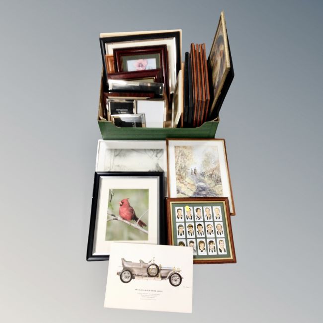 A box of assorted pictures and prints of birds, impressions, photo frames, NUFC cigarette cards etc