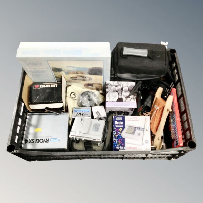 A box of JVC digital video camera, fishing reels, art set, etc