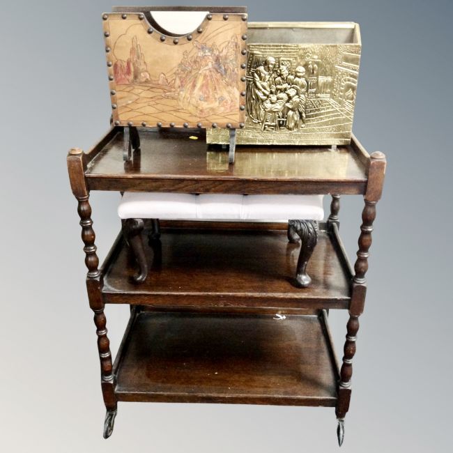 An Edwardian oak tea trolley, brass embossed magazine rack, further magazine rack and a footstool