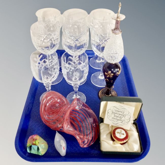 A Toye, Kenning and Spencer enamelled miniature trinket box, glass paperweight, six crystal wine glasses, further glass ware