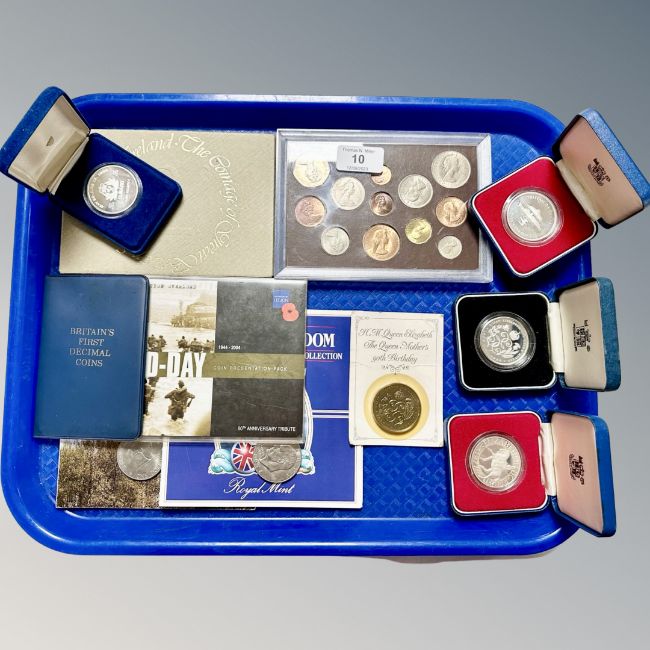 A tray of British decimal coins sets, cased crowns, D-Day 60th Anniversary coin pack etc