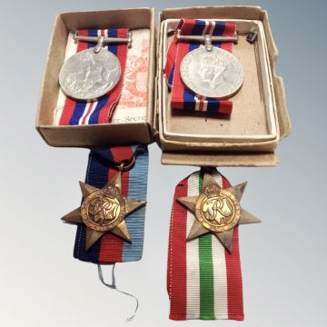 Four WWII medals comprising War Medal (x2), Italy Star, 1939-1945 Star, in box of issue addressed to G. Shield, Newcastle on Tyne