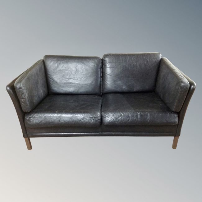 A Scandinavian black leather two seater settee
