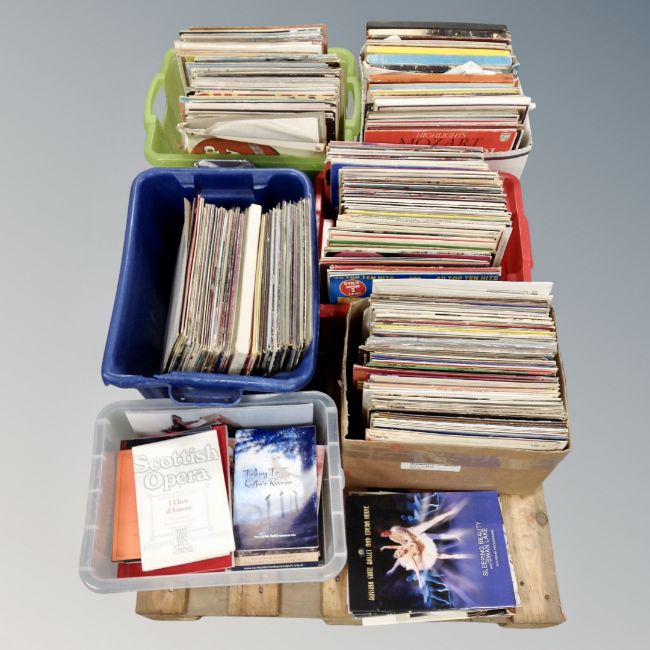 A pallet of six boxes of vinyl records, compilations, easy listening, classical, theatre programmes etc