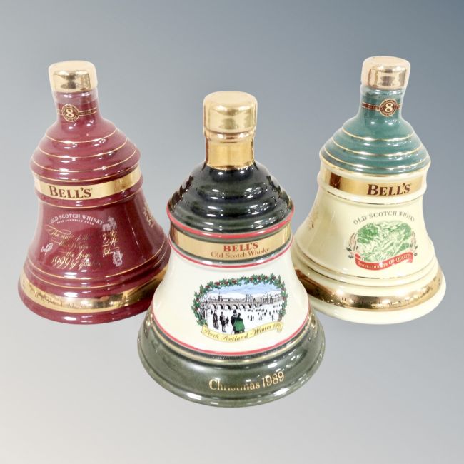 Three Wade Bell's Scotch whisky commemorative decanters : Christmas 1989, 1998, 1999, 75 cl and 70cl, sealed