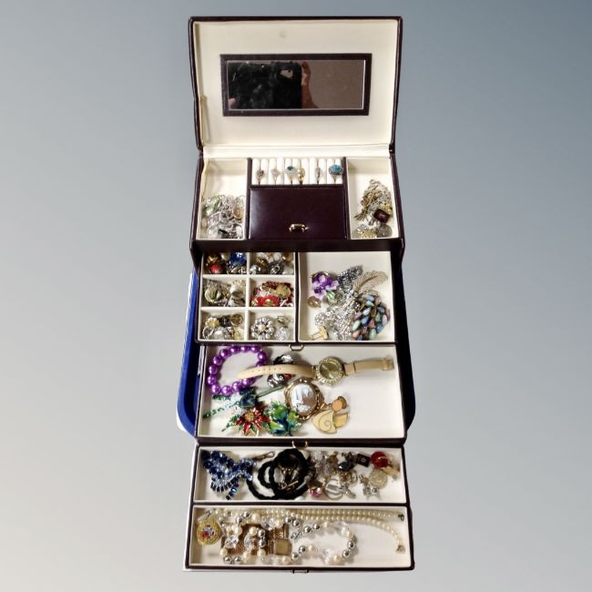 A leather jewellery box fitted with drawers containing a large quantity of vintage and later costume jewellery, ornate brooches, cameos, gilt fob seal, dress ring, pendants on chains etc