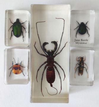 A collection of insects in resin blocks, to include whip scorpion, dune beetle, scarab beetle, Hibiscus bug, and an european hornet.