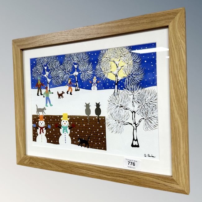 Gordon Barker : Figures playing in a snowy landscape, oil painting, 34 cm x 24 cm.