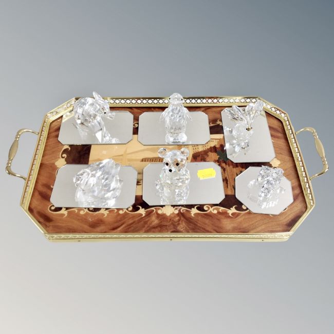 A marquetry gallery tray, six Swarovski animal ornaments on mirrored stands