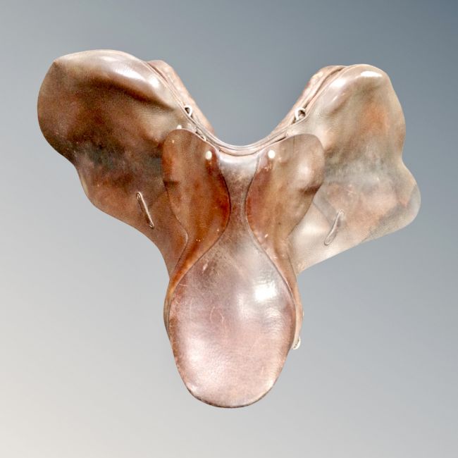 A leather 16" saddle together with a Grecian style metal figure of a man