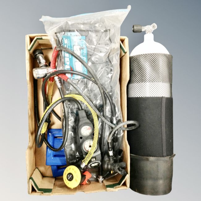 A quantity of scuba diving equipment : dry suit, tank, breathing apparatus, gauges, flippers