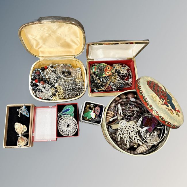 A box of mixed costume jewellery, wristwatch, bead necklaces, brooches etc