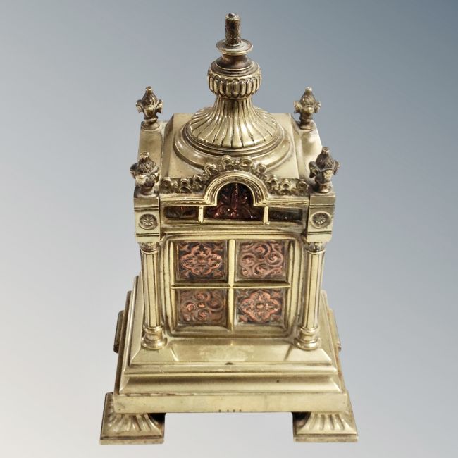 An ornate Victorian brass mantel piece garniture, height 26 cm