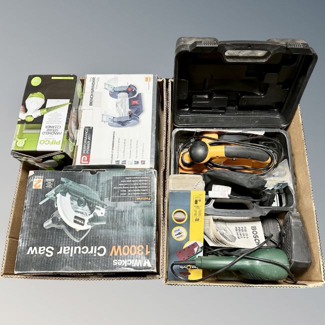 Two boxes of power tools, Performance bench grinder, Wickes circular saw, JCB electric planer, Bosch sander, PIfco hand held steam cleaner