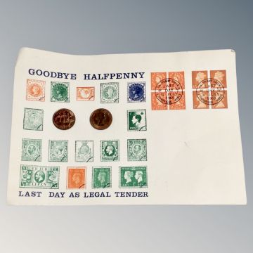A tin of mixed coins and a last day of legal tender half penny sheet