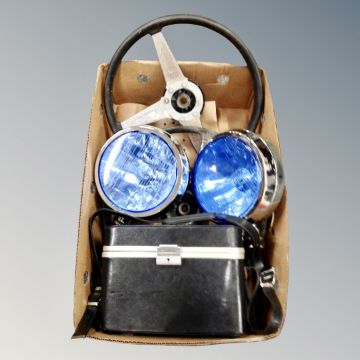A box of two vintage steering wheels, pair of vintage chrome car head lamps with blue glass lenses together with a Pratika camera in bag