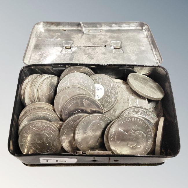 A vintage tin money box containing 50 assorted crowns