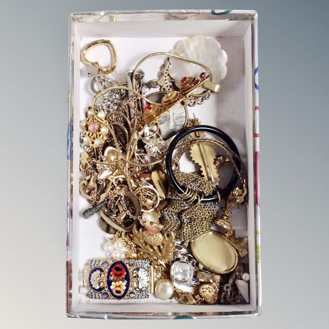 A collection of white and gilt metal jewellery, enamelled buckle