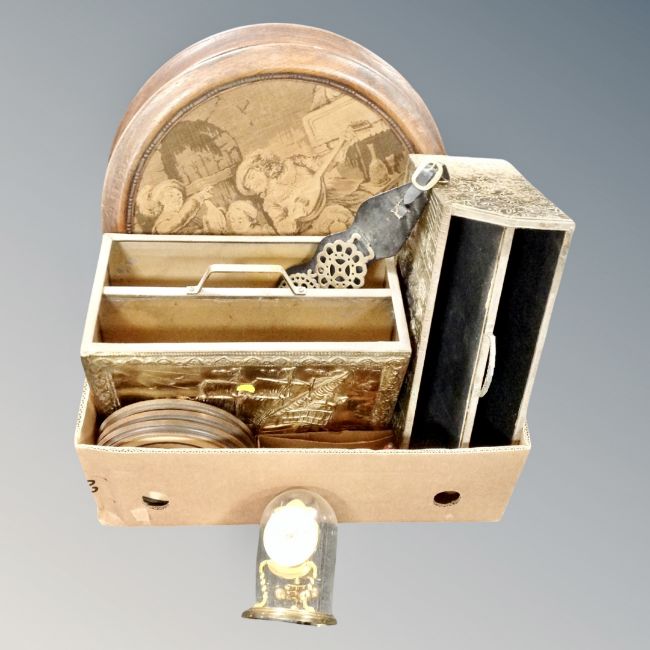 A box of two brass magazine racks, horse brasses, anniversary clock, tapestry panel in oak frame