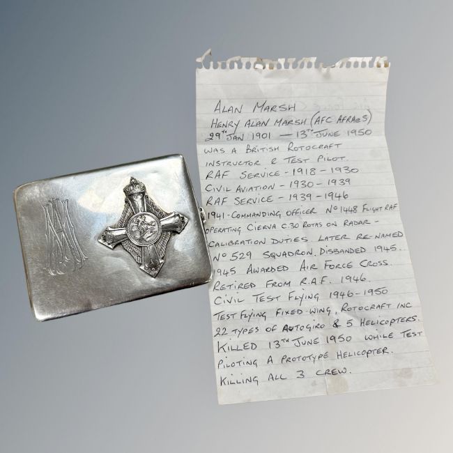 An interesting silver-plated cigarette case, monogrammed AM and inset with a nickel-plated die cast copy of an Air Force Cross, accompanied by a note outlining a possible connection to renowned British test pilot Alan Marsh (1901-1950).