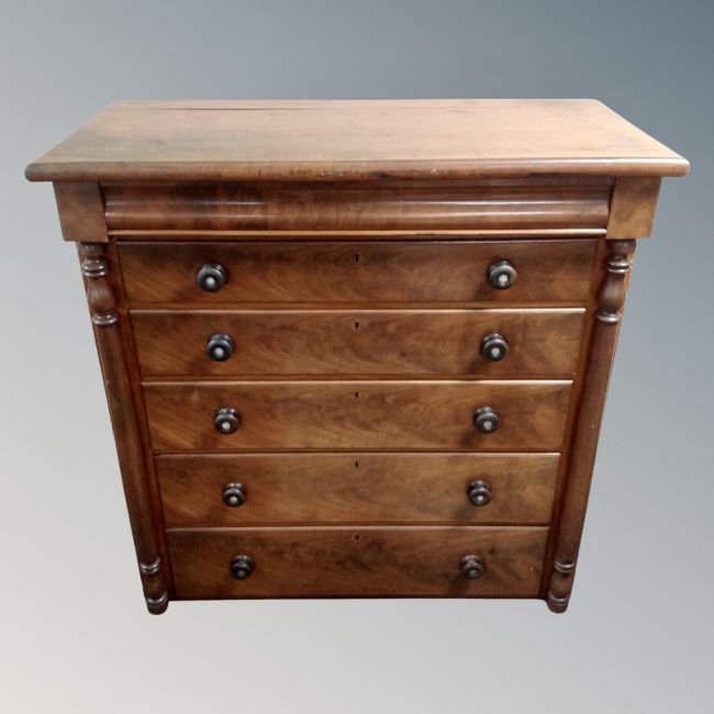 A Victorian mahogany five drawer Scotch chest, width 126 cm