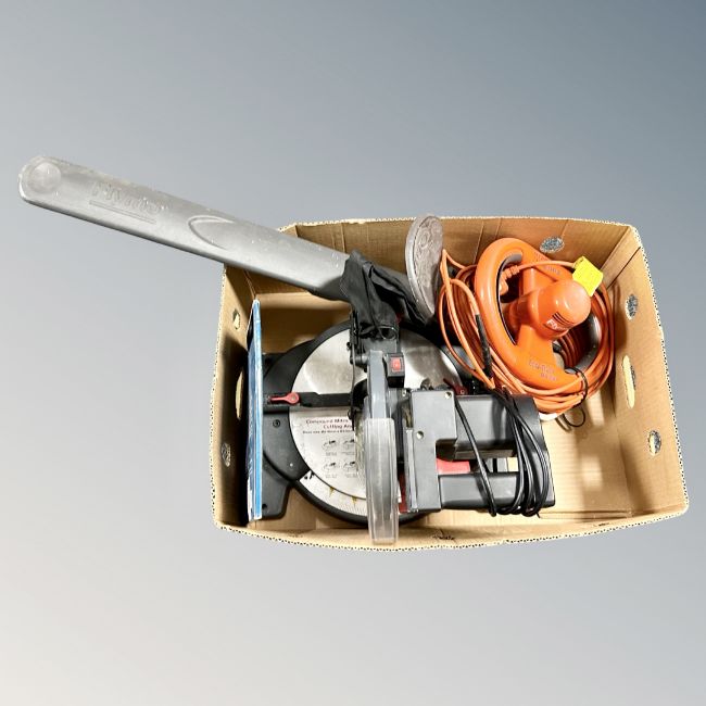 A Performance 210mm compound mitre saw with pack of Erbauer blades together with a Flymo EASi trim ETM 530 hedge trimmer with lead