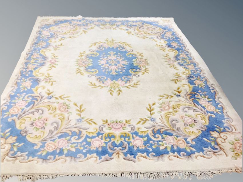 A Chinese floral carpet on blue and cream ground 280 cm x 360 cm