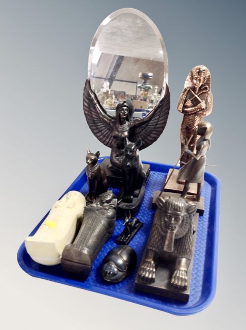 A quantity of Egyptian style cast figures, dressing table mirror, Sphinx, mummies, Leonardo Collection figure of a Pharaoh etc