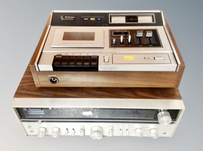 A Technics four channel / two channel receiver together with a Technics Cassette stereo deck with instructions