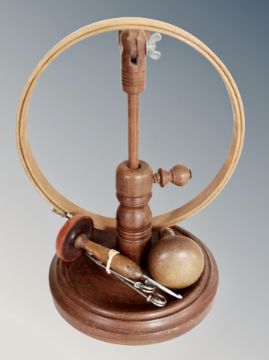 A Lawrence & Lowings versatile and adjustable embroidery hoop, two darning mushrooms etc