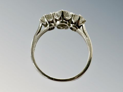 A platinum three stone diamond ring, the principal stone weighing 1.17 carat, flanked by two stones weighing 0.35 carat each, size M.