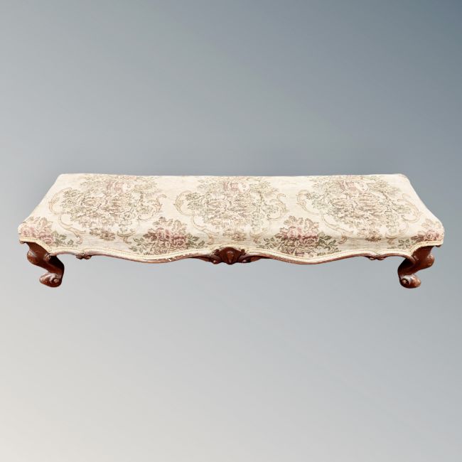 A rectangular long footstool in tapestry fabric together with a further footstool