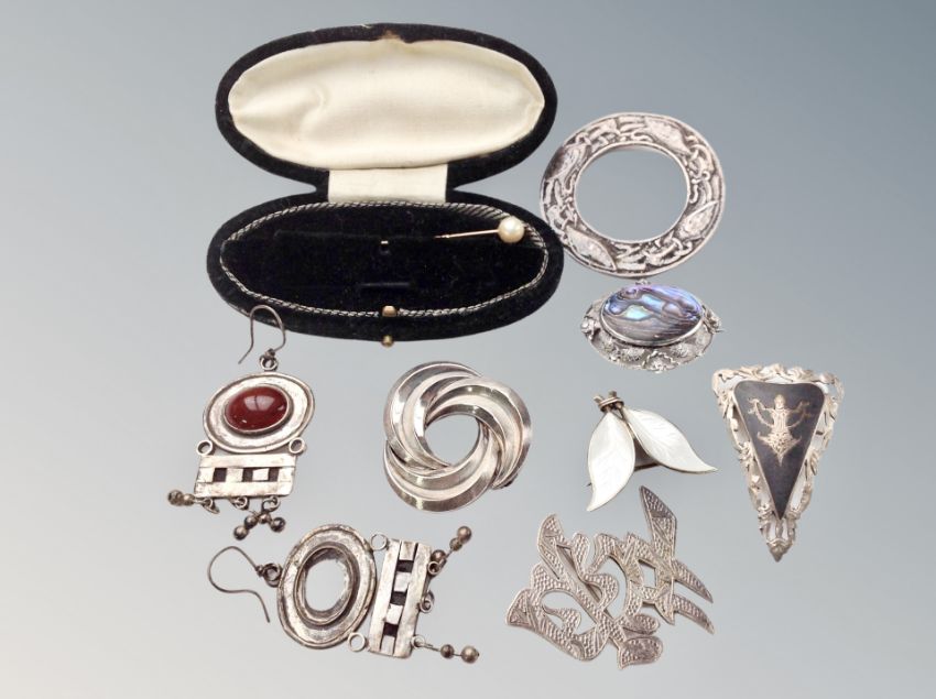 A group of silver jewellery including Celtic brooch, abalone brooch, Norwegian enamelled silver brooch by David Andersen, pearl stick pin etc