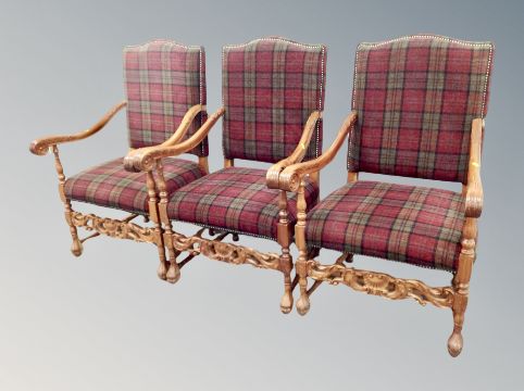 Three reproduction carved armchairs in tartan upholstery